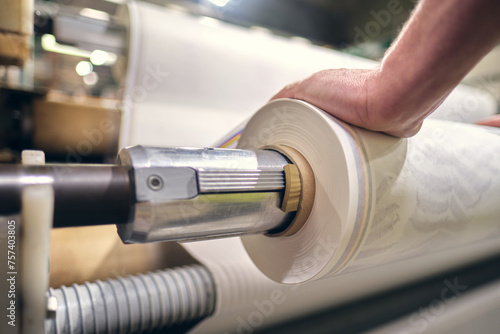 Hands on rollers Industrial printing Cyan magenta yellow black and pink colour inkjet and laser jet ink industrial printing machine in a print house. Mass bulk printing.