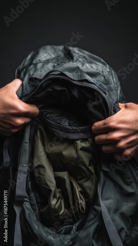 backpack, hand, opening, olive, interior, rugged, dark, background, green, hard-wearing, fabric, gear, hiking, travel, adventure, zip, pocket, storage, camping, carry, equipment, pack, nylon, hand, lifestyle, exploration, accessory, traveler, sport, utility, trekking, trip, versatile, unzip, black, tactical
