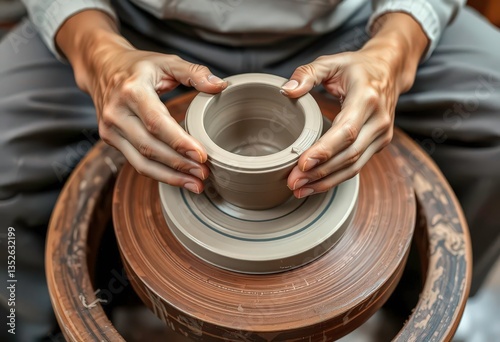Hands shaping clay on a wooden pottery wheel, creating a vessel, traditional, work
