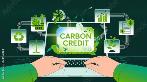 laptop, hand, typing, carbon, credit, concept, environmental, sustainability, illustration, graphic, design, eco, green, renewable, energy, economy, finance, future, technology, datum, analysis, information, diagram, diagrammatic, report, process, network, connection, icon, symbol, element, progress, growth, investment, system, strategy, innovation, solution, sustainable, business