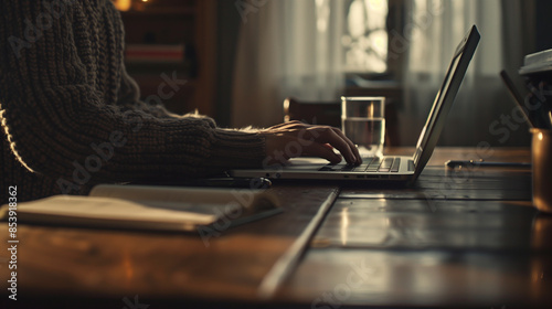 hand, typing, laptop, cosy, home, setting, indoor, work, home office, technology, computer, comfortable, desk, workspace, warm, interior, soft light, office, professional, evening, digital, casual attire, modern, home interior, working environment, relaxed