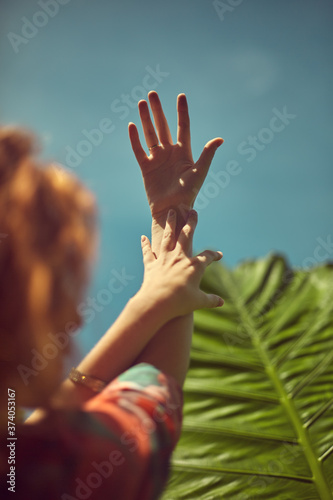 arm, art, background, closeup, colourful, cute, ethnic, female, crafty, freckle, freedom, fun, ginger, gold, gold, green, hand, higher, isolated, lifestyle, nature, up high, overhead, park, redhead, sexy, signs, skin, sky, style, summer, sun, travel, up, white, woman, woman, wrist, young, hand, people, human