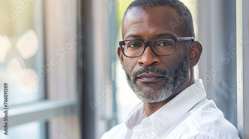 Handsome 45 years old gentle black African American man, wearing glasses, formal slick hairstyle, smooth face in a modern office building, wearing white shirt, beside a huge window
