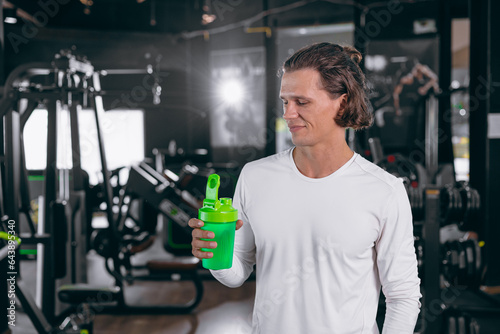 handsome adult fitness man hand holding whey shaker for happy drinking whey protein for healthy muscle