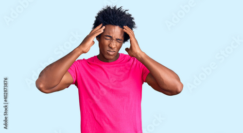 Handsome african american man with afro hair wearing casual pink tshirt suffering from headache desperate and stressed because pain and migraine. hands on head.