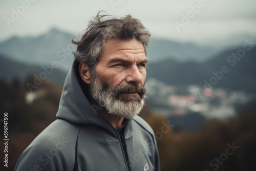 Handsome bearded man with long gray hair and beard in sportswear standing on top of mountain and looking away