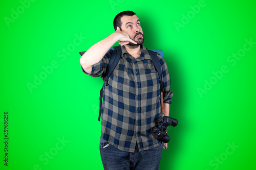 Handsome bearded traveler man making phone gesture over green studio background