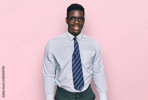 Handsome business black man wearing white shirt and tie looking positive and happy standing and smiling with a confident smile showing teeth
