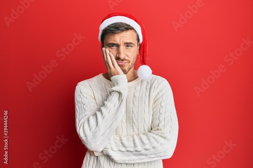 Handsome caucasian man wearing christmas hat thinking looking tired and bored with depression problems with crossed arms.