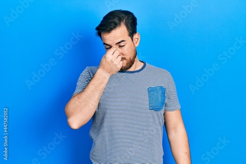 Handsome caucasian man with beard wearing casual striped t shirt tired rubbing nose and eyes feeling fatigue and headache. stress and frustration concept.