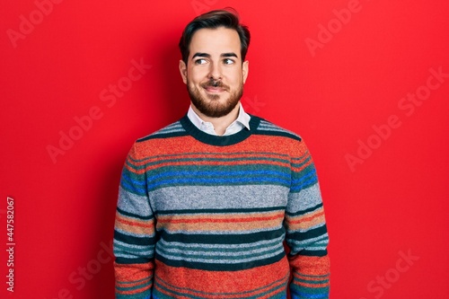 Handsome caucasian man with beard wearing elegant wool winter sweater smiling looking to the side and staring away thinking.
