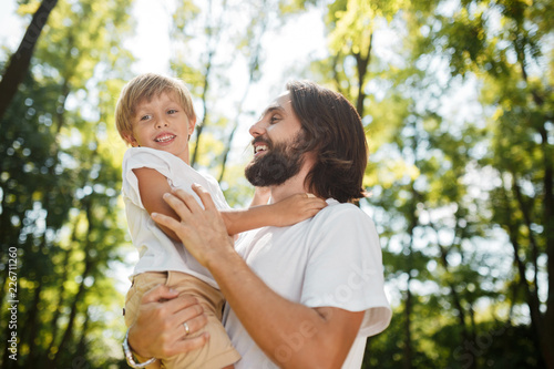 Handsome dark-haired father with beard dressed in the white t-shirt is holding in the arms his little son and watching at him on a summer day in the park.