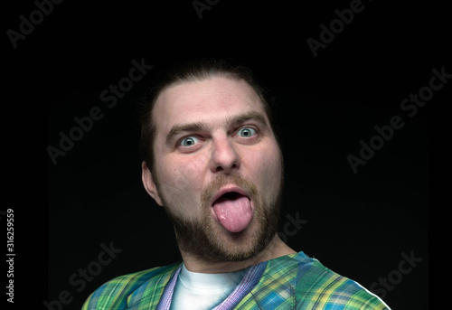 handsome fooling around tricky fun man with beard sticking out tongue and looking at camera isolated on black
