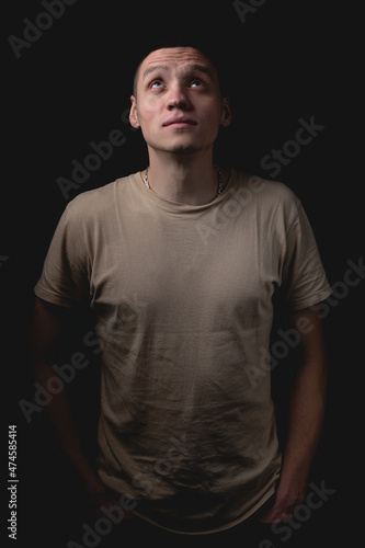 adult, attractive, background, beautiful, black, casual attire, caucasian, colours, dark, detail, european, face, fashion, guy, photogenic, health, isolated, lifestyle, look, looking, male, man, model, 1, people, person, portrait, posing, praying, shadow, single, stay, studio, style, stylish, t-shirt, ukrainian, up