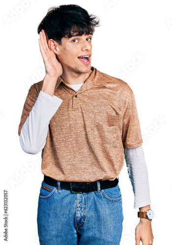 Handsome hipster young man wearing 90s retro style smiling with hand over ear listening and hearing to rumor or gossip. deafness concept.