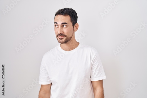 Handsome hispanic man standing over white background smiling looking to the side and staring away thinking.