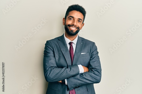 Handsome hispanic man with beard wearing business suit and tie happy face smiling with crossed arms looking at the camera. positive person.