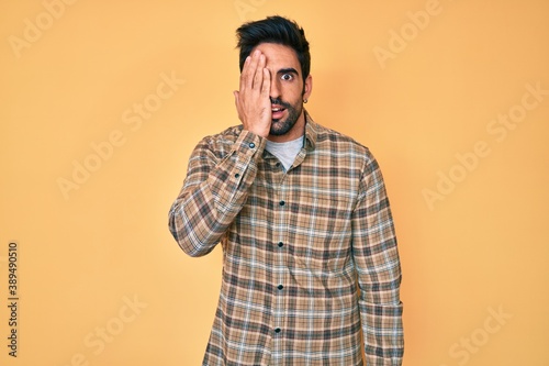Handsome hispanic man with beard wearing casual clothes covering one eye with hand, confident smile on face and surprise emotion.