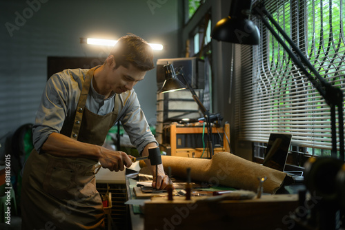 Handsome male tailor working with leather using hammer in his workshop. Small business and handmade concept