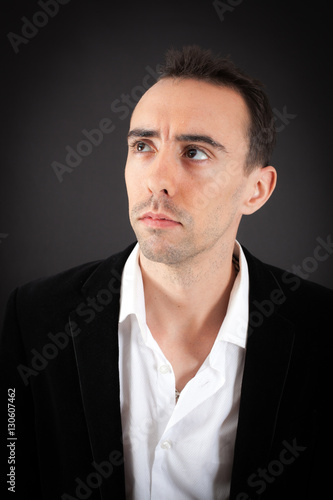 adult, black background, brown hair, casual attire, copy space, creativity, fashion model, idea, imagination, isolated, jacket, jean, male, man, one man only, one person, pensive, people, standing, studio shot, thinking, caucasian, portrait