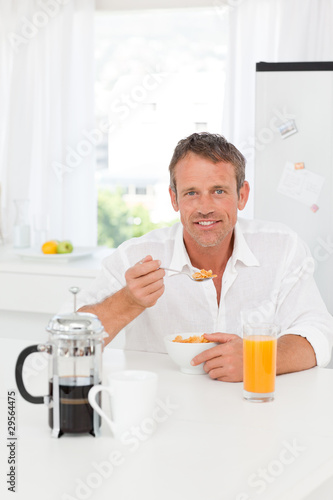 attractive, breakfast, cereal, hot drink, eat, flake, healthy, home, morning, orange, smile, young, adult, brunet, cute, diet, dining, guy, photogenic, hispanic, hotel, indoor, juice, latin, lifestyle, male, man, nourishment, people, person, room, smiley