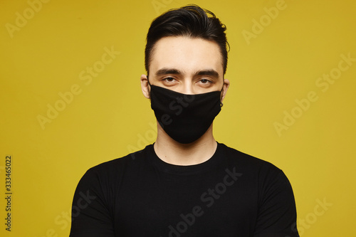 Handsome man in black t-shirt and black protective mask isolated on yellow background. Seasonal illness, and seasonal flu concept. Healthcare lifestyle concept