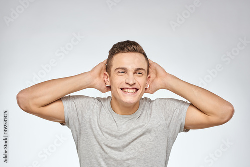 Handsome man in gray t-shirt cropped view of emotion Studio Model