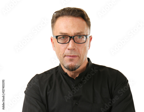 adult, age, aged, attractive, background, black, casual attire, caucasian, closeup, confident, cool, emotion, fashion, fashionable, front, goggles, haircut, photogenic, isolated, looking, male, man, mature, middle, middle-aged, model, 1, person, portrait, posing, senior, serious, sexy, shirt, short, showing, spectacle, stylish, view, white, year