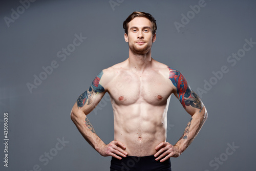 handsome man with a naked pumped-up torso tattoos on his arms holds his hands on his belt
