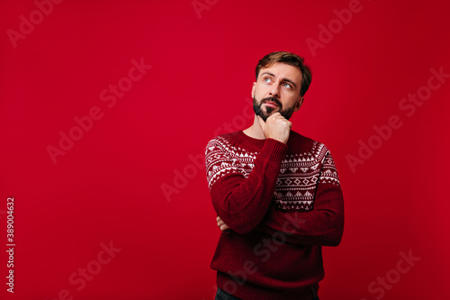 Handsome man with brown hair thinking about something. Studio shot of pensive caucasian guy with beard standing on red background.
