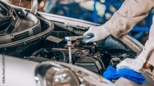 handsome mechanic in uniform is working in auto service. Car repair and maintenance.