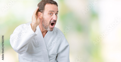 Handsome middle age senior man wearing kimono uniform over isolated background smiling with hand over ear listening an hearing to rumor or gossip. Deafness concept.