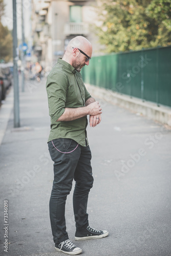 man, middle, age, mature, bald, beard, bearded, rebel, hipster, italian, european, milan, italy, photogenic, sunglasses, authentic, grizzly, urban, city, shirt, jean, real, punk, alternative, candid, unusual, diverse, diversity, caucasian, modern, lifestyle, style, stylish, attractive, casual attire, cool, fashionable, male, contemporary, trendy