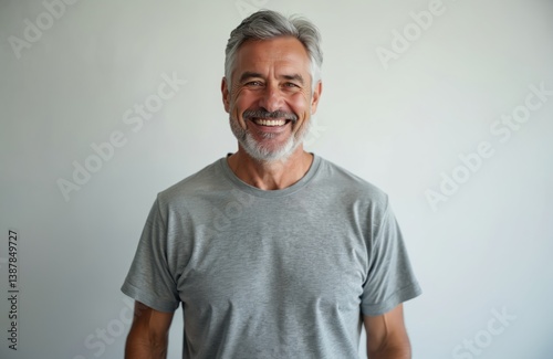 Handsome middle-aged grey-haired man in casual t-shirt smiles on white backdrop. Happy, cheerful, self-assured male model with good mood, easygoing attitude. Ideal for business, lifestyle, health