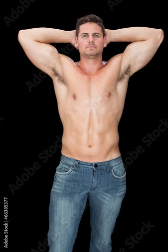 young adult, man, male, caucasian, fit, toned, healthy, fitness, health, physical, shape, body, standing, attractive, bodycare, cut-out, isolated, posing, muscular, bodybuilder, bodybuilding, physique, lifestyle, torso, photogenic, shirtless, strong, strength, muscle, sexy, jean, denim, bicep, serious, portrait, black background