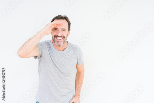 Handsome senior man over isolated background very happy and smiling looking far away with hand over head. Searching concept.