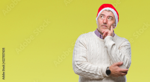 Handsome senior man wearing christmas hat over isolated background with hand on chin thinking about question, pensive expression. Smiling with thoughtful face. Doubt concept.