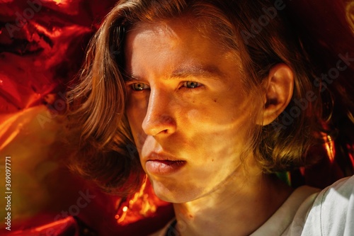 dreamy, magic, vibrant, creative, luxury, unusual, contemporary, lip, unique, contemplation, light, trendy, concept, iridescent, tempting, colourful, intimacy, surreal, bright, stylish, blond, inferno, strange, blaze, imagination, sparkly, authentic, illumination, simplicity, attractive, human face, shine, attraction, serious, amazing, holographic, sensual, affectionate, hologram, science, aesthetic, hell, head shot, red, photogenic, portrait, gorgeous, glow, passion, glitch, odd, glance, natural, gaze, mystery, futuristic, mysterious, fury, music, foil, many-coloured, flare, many-coloured, looking away, fashion, mouth, copy space, fantasy, modern, long hair, fantastic, model, copy space, fancy, weird, fairy, metallic, vogue, face, magnificent, vision, caucasian, white, man, male, person, people, adult, adult, 20s, young adult, young adult, young person, grown-up