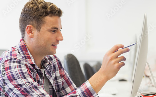 20s, young adult, man, male, caucasian, indoor, school, college, university, education, desk, computer, using, screen, technology, computer monitor, student, sitting, working, studying, casual attire, shirt, photogenic, attractive, brown hair, brunette, pen, pointing, learning, happy, smiling, cheerful