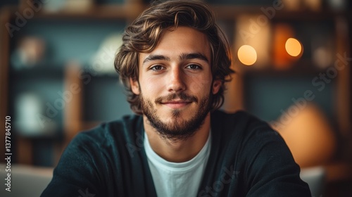 Handsome young businessman sitting in a restaurant with a serious expression, smiling casually while looking at the camera, with a beard and stylish hair