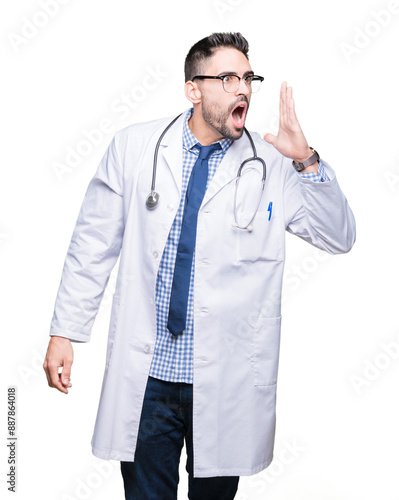 Handsome young doctor man over isolated background shouting and screaming loud to side with hand on mouth. Communication concept.