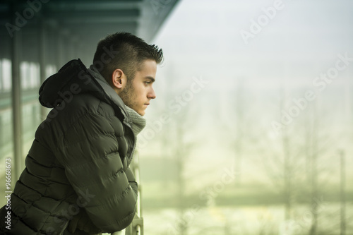 man, young, model, male, profile, side, casual attire, fashion, photogenic, attractive, thinking, cold, sad, urban, thoughtful, winter, foulard, walking, bridge, fog, grey, jacket, journey, voyage, stroll, leather, looking down, smog, blue eye, green eye