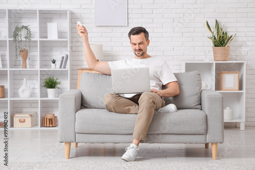 Handsome young man sitting on sofa with air conditioner remote control and using laptop in living room