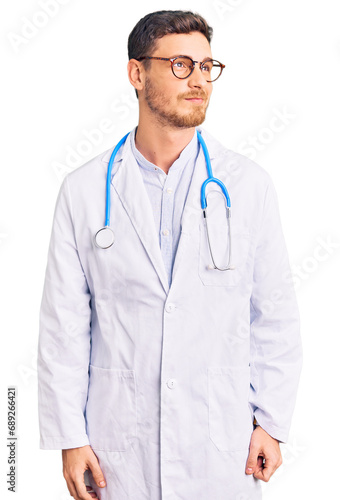 Handsome young man with bear wearing doctor uniform smiling looking to the side and staring away thinking.