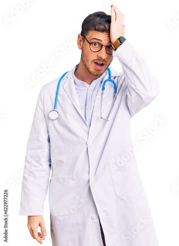 Handsome young man with bear wearing doctor uniform surprised with hand on head for mistake, remember error. forgot, bad memory concept.