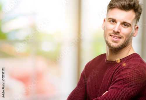 Handsome young man with crossed arms confident and happy with a big natural smile laughing
