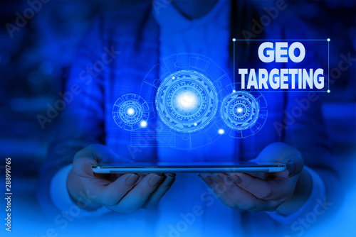 Handwriting text writing Geo Targeting. Conceptual photo Digital Ads Views IP Address Adwords Campaigns Location Woman wear formal work suit presenting presentation using smart device