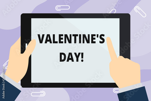 Handwriting text writing Valentine S Day. Conceptual photo roanalysistic holiday celebrated each year on February 14 Hand Holding Pointing Touching Blank Rectangular Color Tablet White Screen