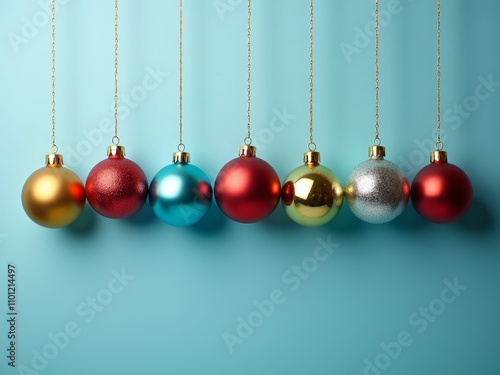 Hanging Christmas ornaments in vibrant colors create a festive atmosphere against a soft blue backdrop