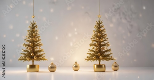 Hanging Christmas tree lights and ornaments made of gold in a minimalist setup on an isolated white background, elegant, gold